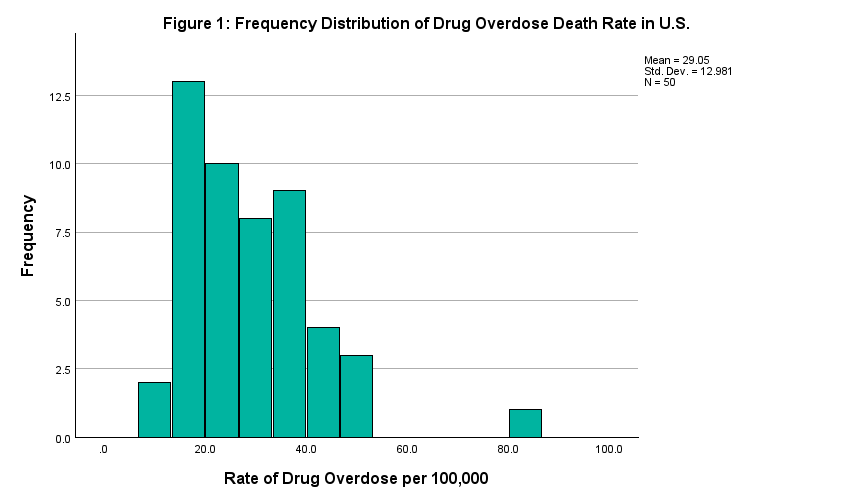 Figure 1 contains a histogram displaying the frequency distribution of the dependent variable, drug overdose death rates. As mentioned previously, the data has a positive skew and, due to high overdose death rates in West Virginia, Kentucky, Delaware and elsewhere, the mean is being pulled above the median in the overall distribution.